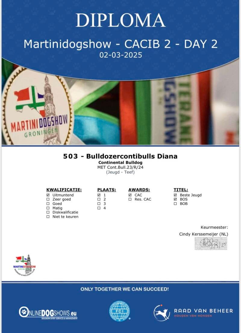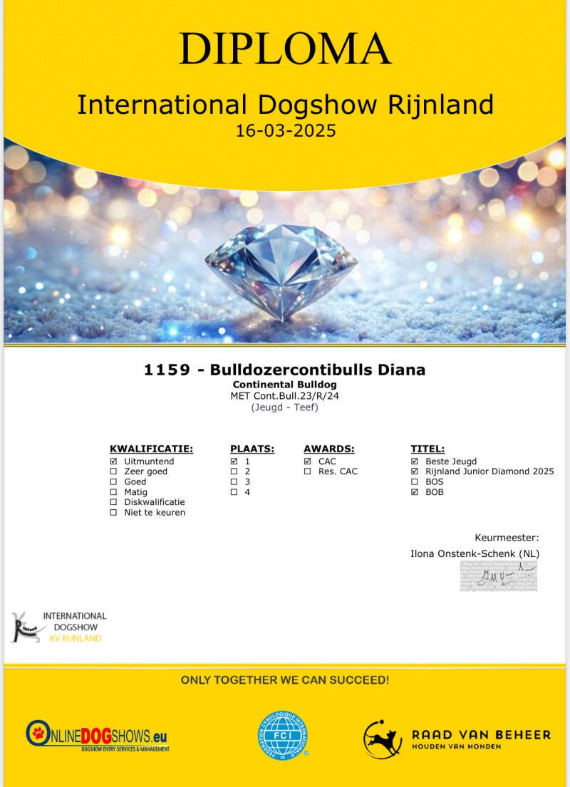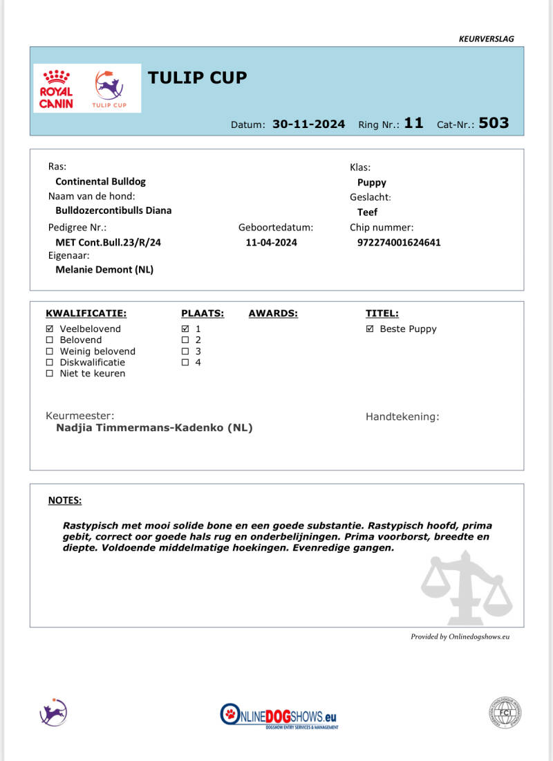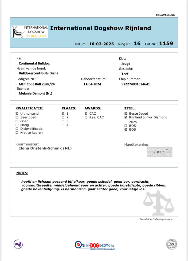 Keurverslagen zijn gedetailleerde beoordelingen die worden opgesteld door erkende keurmeesters tijdens hondenshows. Deze rapporten bevatten evaluaties van de hond op basis van verschillende criteria, waaronder beweging, gedrag en rasstandaard. Ons doel bij Irresistible Pride Conti's is om niet alleen te trainen, maar ook om samen met onze hond een sterk team te vormen dat uitblinkt op shows. De keurmeesters geven hun professionele mening over onze hond, wat niet alleen ons vertrouwen in ons trainingsproces versterkt, maar ook een belangrijke indicator is van de kwaliteit van onze hond. Wij geloven dat de feedback van keurmeesters cruciaal is voor de ontwikkeling en groei van zowel de hond als de handler. Elk keurverslag vertelt een verhaal van toewijding, expertise en het unieke karakter van onze hond.